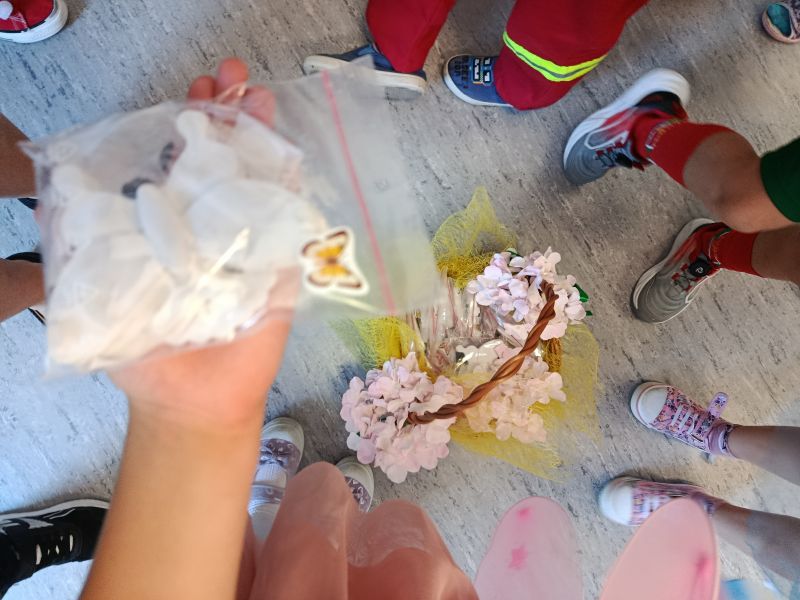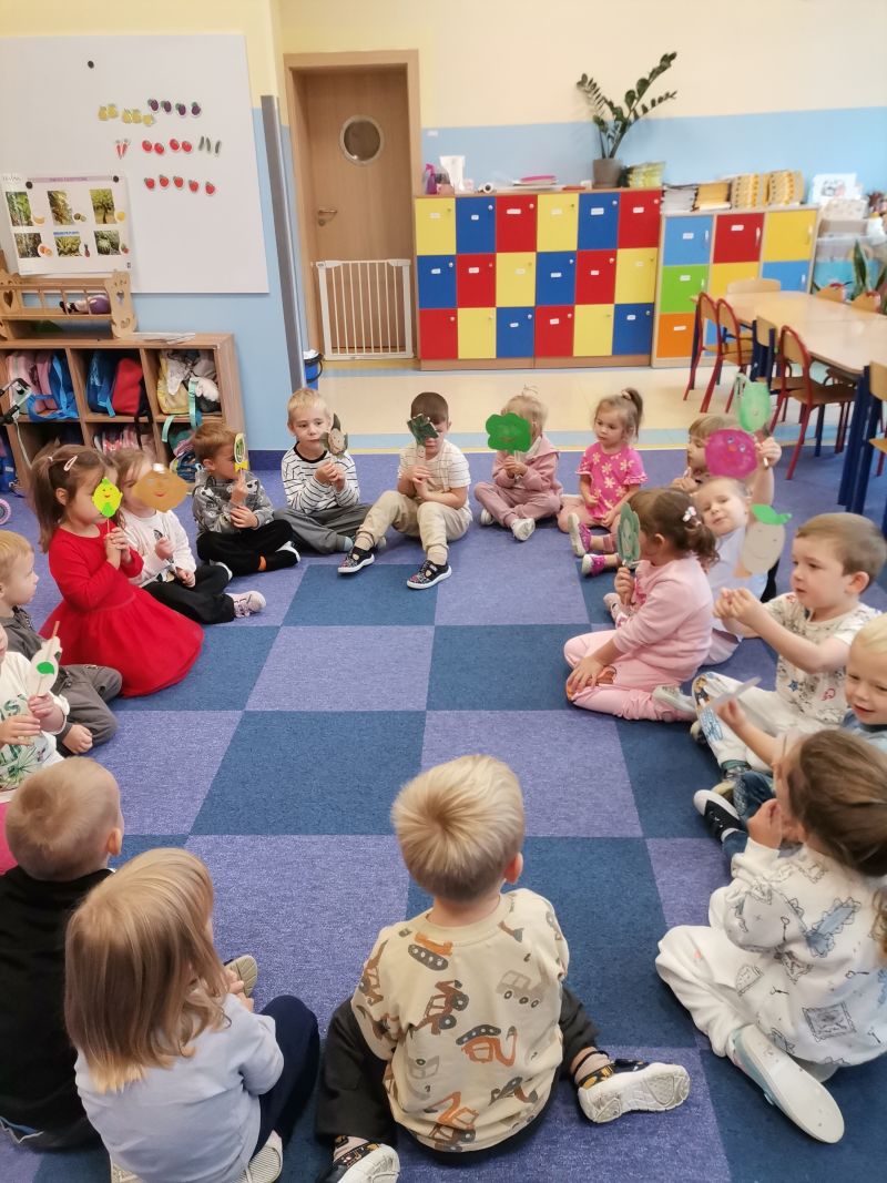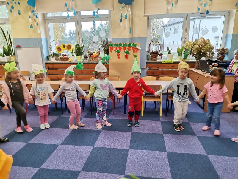 • 7. Dzieci w warzywnych czapkach maszerują w kole z piosenką ,,Idą witaminki''.