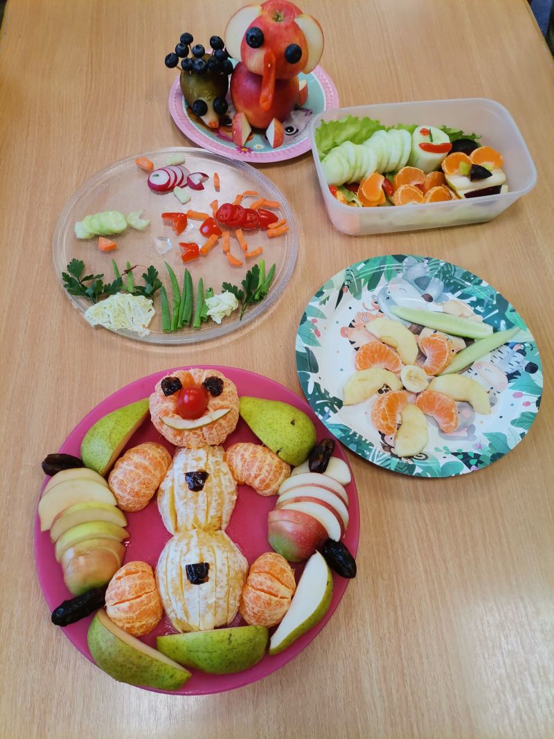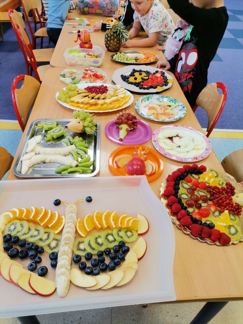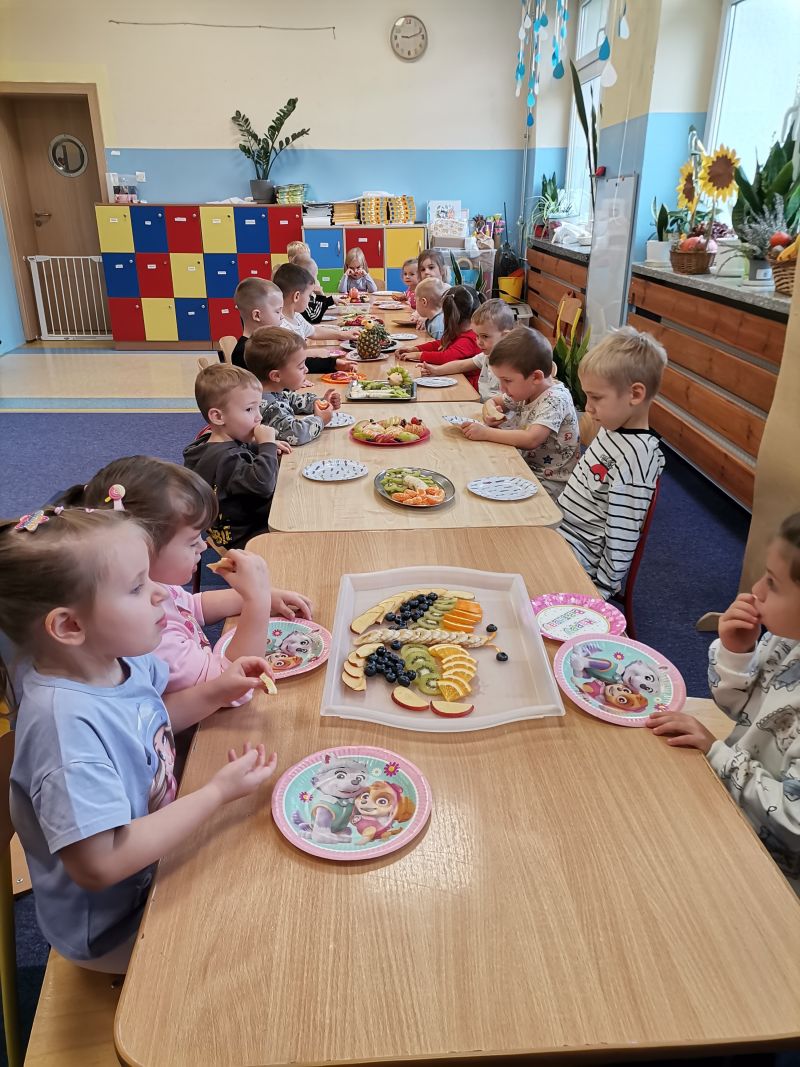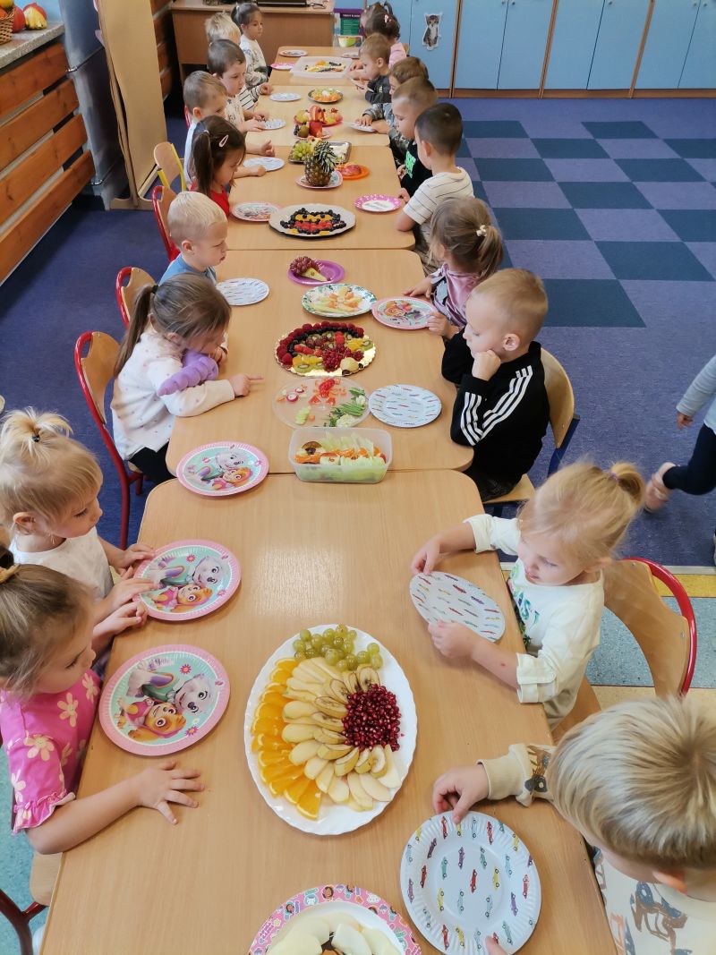 • 3. Uczta owocowo - warzywna - dzieci podziwiają kolorowe cuda na talerzach.