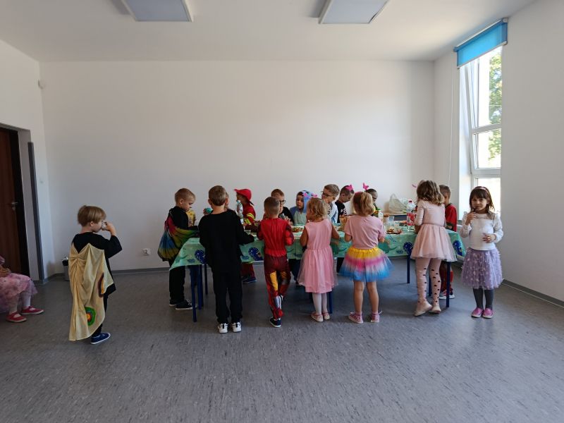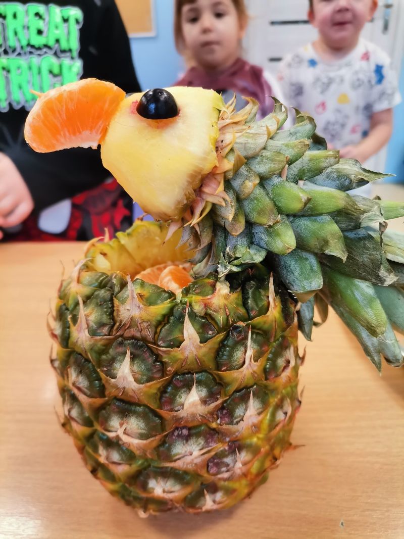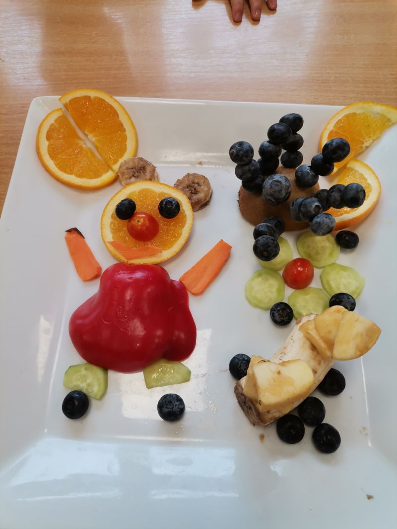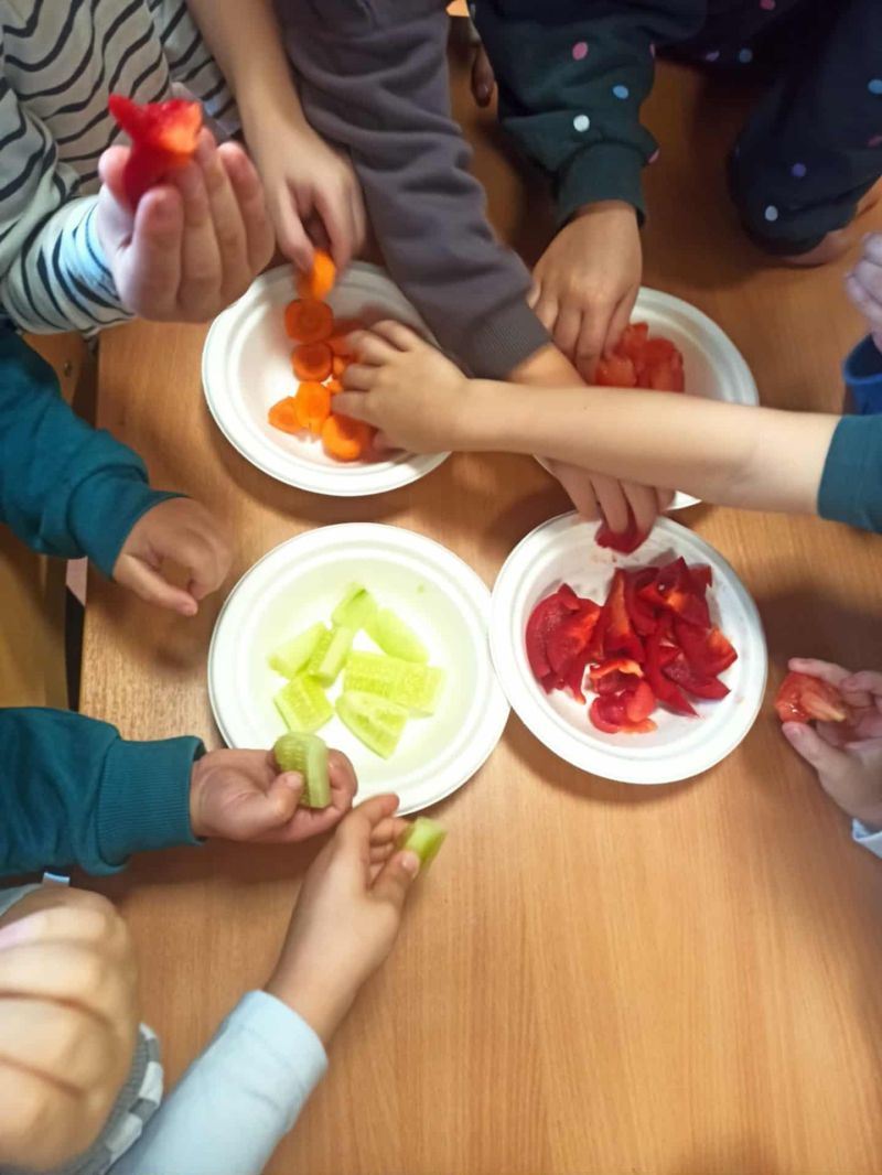 • 3. Uczta owocowo - warzywna - dzieci podziwiają kolorowe cuda na talerzach.
