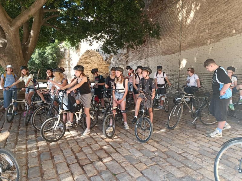 • Uczniowie patrzą a kolegę, który siedzi, trzymając średniowieczny miecz