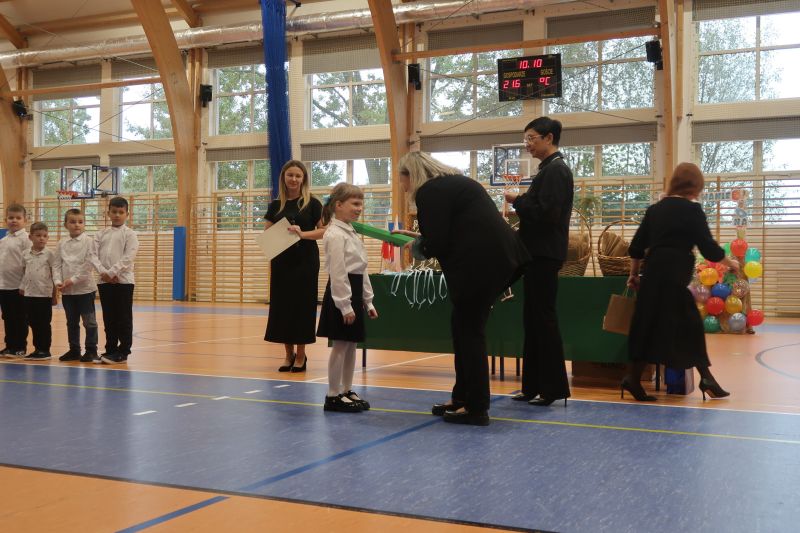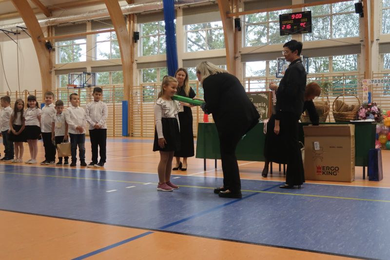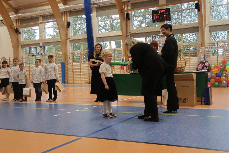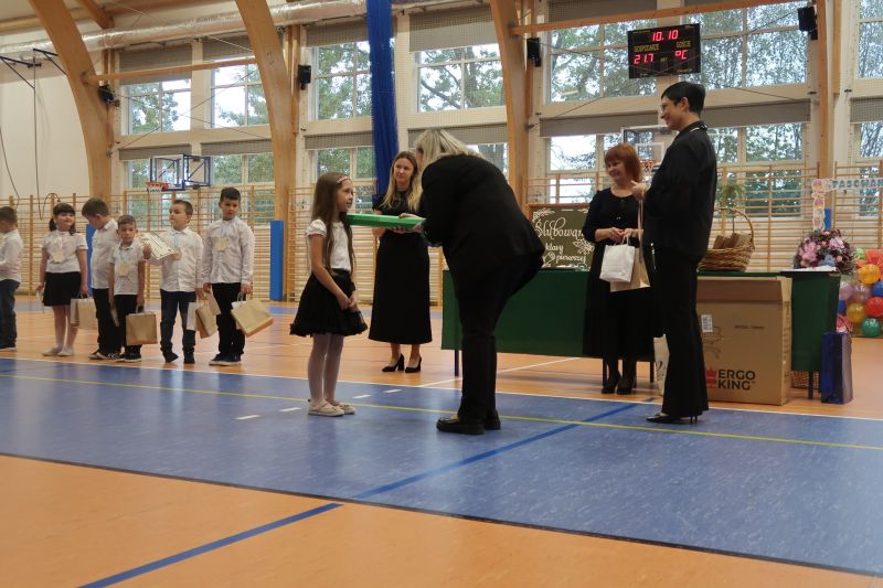 • Uczennica kl. IV pozuje do zdjęcia, trzymając tarczę.